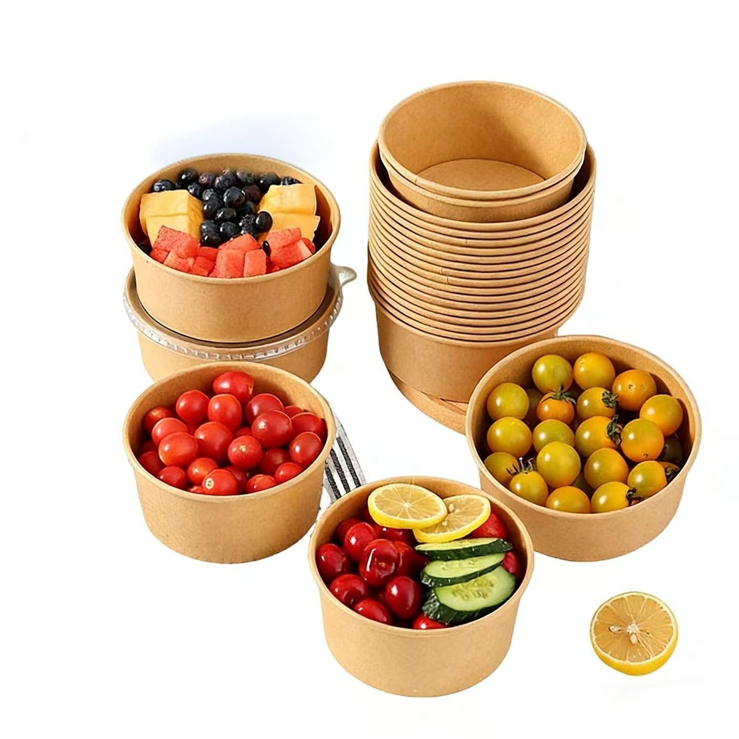 Food-grade disposable kraft paper bowls for wholesale, with capacities: 500/750/1100/1300ml, calibers: 150/185mm. Packed 300 or 600 pieces per carton. Oil/water-resistant, microwave-safe, ideal for fruit salad, takeaway food and catering. Customization is welcome.
